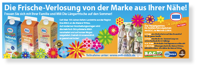 Von Gewinnaktionen, die mit Anzeigen, Flyern und Milchpackungen promotet wurden, bis hin zum Tag der offenen Tür, waren wir bis zum Verkauf von Mili Milch an Hansano die betreuende Agentur für die Mili-Meierei in Trittau.